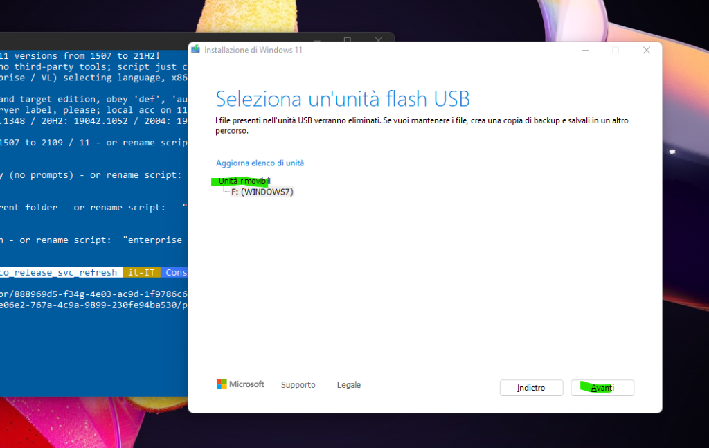 Il terminare powerchell avvierà in automatico l'installazione del filo iso di windows sulla chiavetta USB che disponibile in quel momento nel pc. Clicca avanti per proseguire di installare Windows 11 sulla chiavetta.