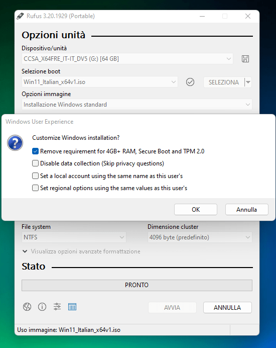 - Verrà richiesta di personalizzare l'installazione "Remove Requirement for 4GB+ Ram, Secure Boot and TPM. Premi OK al termine.