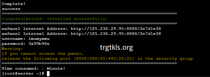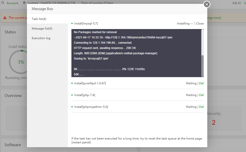 Post selezione della configurazione aapanel, eseguirà le installazione necessari per la configurazione scelta. Tempo di attesa 10-15 minuti a seconda delle periferiche.
