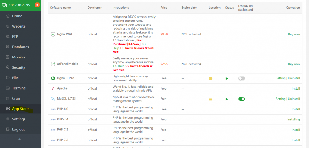 App-store aaPanel, aapanel offre ai propri clienti un'app store per gestire e aggiornare il proprio pannello con le configurazioni disponibili nell'app store.