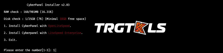 Dopo il controllo della RAM e del disco, ci sono due opzioni per la selezione del server web. Puoi scegliere quello che fa per te. Abbiamo usato OpenLitespeed in questa guida, quindi premi il tasto 1 sulla tastiera e poi premi INVIO per continuare.