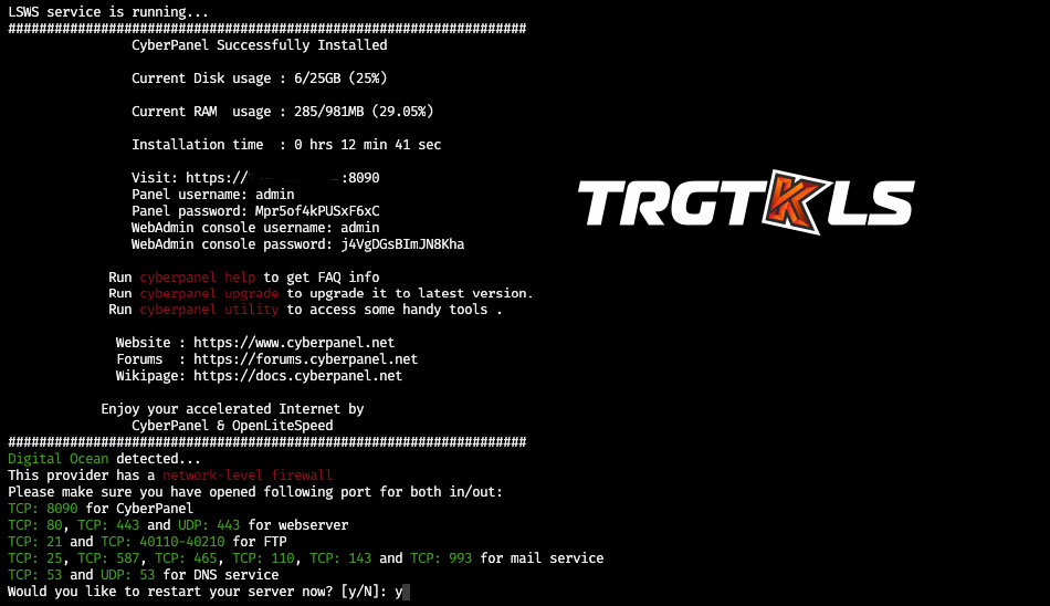 Congratulazioni, ora hai installato CyberPanel sul tuo server senza alcun problema. Da quest'area è possibile accedere alle informazioni di accesso al pannello e alle informazioni di accesso di Web Admin.