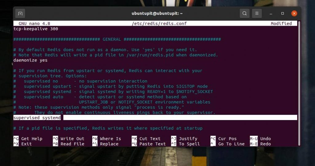 Al termine dell'installazione, ora puoi eseguire una piccola configurazione per rendere attivo Redis. Innanzitutto, esegui il seguente comando sulla shell per modificare il file di configurazione di Redis. Quando lo script si apre, trova la sintassi supervisede modificare il valore da no a systemd quindi salva ed esci dal file. Questo piccolo cambiamento nello script ti consentirà di eseguire Redis sul tuo sistema come demone e ottenere un maggiore controllo sullo strumento Redis.