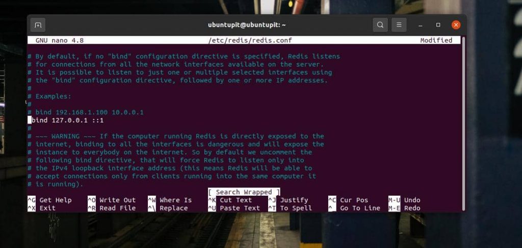 Come hai già visto, la configurazione predefinita utilizza l'indirizzo localhost (127.0.0.1) per accedere a Redis. Ma se hai installato Redis sulla tua macchina Linux utilizzando altri metodi, è possibile che tu abbia abilitato l'accesso a Redis anche da altre posizioni IP pubbliche. Per fermarlo, esegui il seguente comando sulla shell del terminale per modificare lo script di configurazione di Redis.