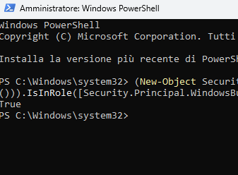 Per verificare se l'utente è un membro del gruppo Administrators, esegui il comando seguente in PowerShell. Se ritorna”True“, significa che sei un membro del gruppo Amministratore.