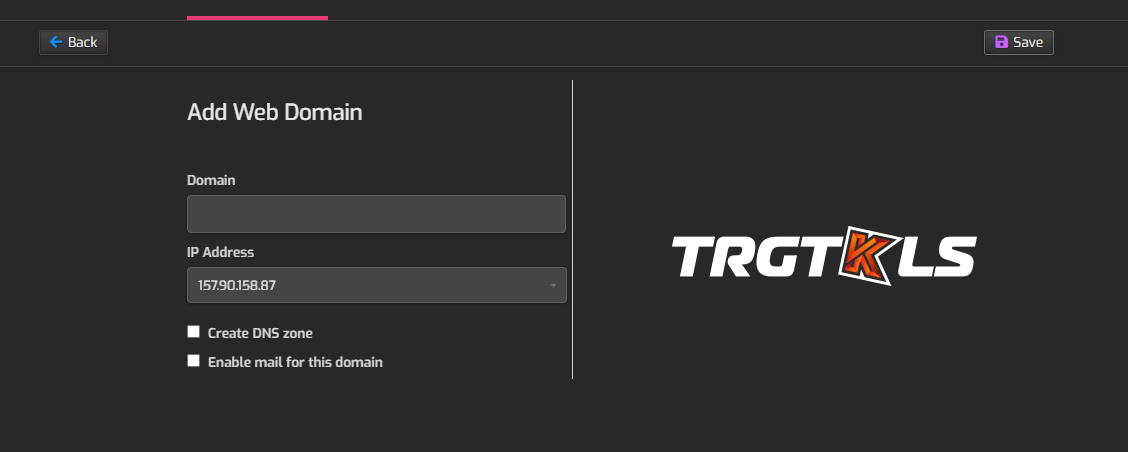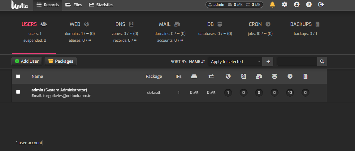 Prima di aggiungere un dominio e neccessario creare un nuovo utente dal menu il altro cliccare USERS per aggiungere un nuovo utente. Dopo aver creato l'utente fare l'accesso al pannello di controllo https://indirizzoIP:8083/. Sempre nel menu di navigazione scegliere WEB per poi cliccare Add Web Domain per aggiungere nome dominio.