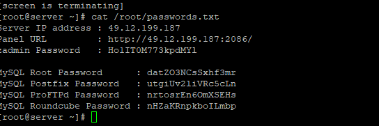 Dopo l'installazione ti espellerà dalla sessione dello schermo, puoi vedere tutte le informazioni di accesso quando esegui il comando seguente;