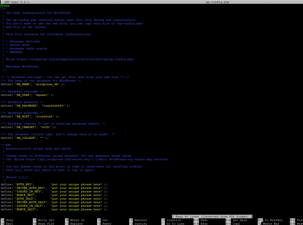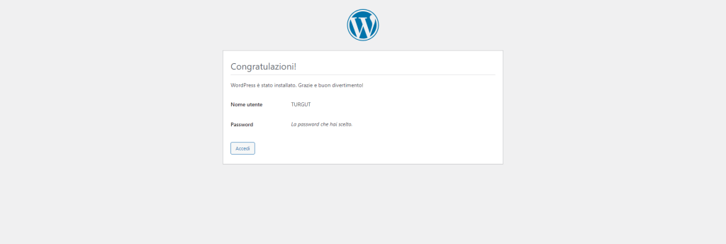 Modificare i dettagli del database (DB_NAME, DB_USER e DB_PASSWORD) con le informazioni del database. Dopo aver modificato i parametri e credeziali database e utente procedi dal browser per completare l'installazione di Wordpress.