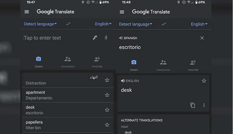 Con la sua forma rinnovata, Google Translation, che è tornato in uso con il supporto della modalità oscura, offre agli utenti un'esperienza di "modalità notte" dominata dal grigio anziché un'esperienza di modalità completamente oscura. Nell'applicazione che assume una struttura in cui il grigio viene alla ribalta con la sua modalità dark mode; Le icone sono disegnate in blu e lo sfondo con la cronologia delle traduzioni è disegnato in nero. A questo punto, quando scrivi un articolo nella parte della traduzione, possiamo dire che gli articoli appaiono in un colore bianco pallido.