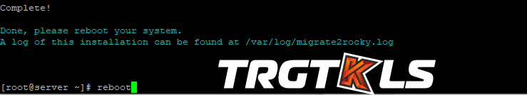 Una volta completata la migrazione, ti verrà chiesto di riavviare il sistema come mostrato. Per riavviare, eseguire il comando: