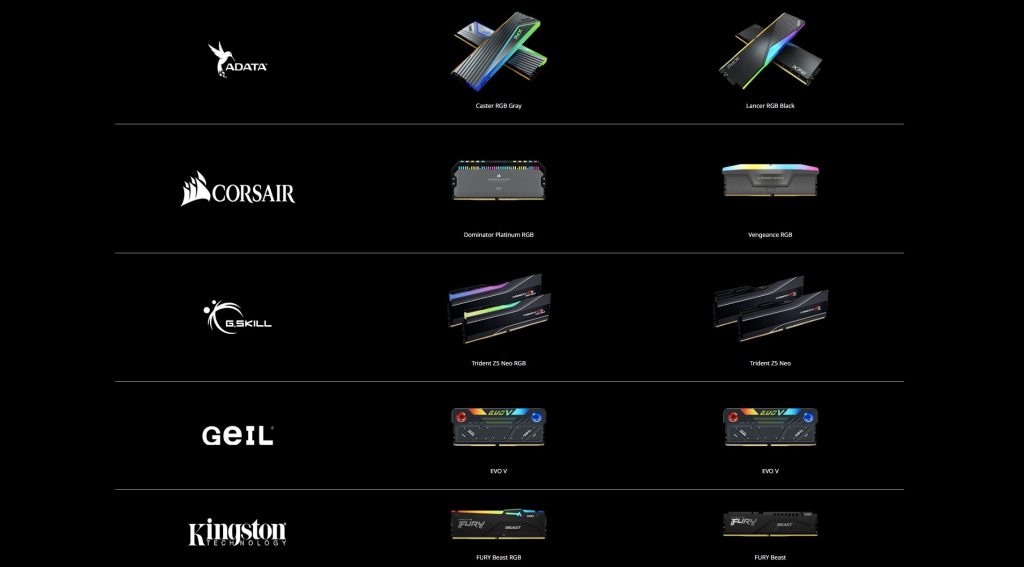 I giocatori che utilizzano la nuova tecnologia saranno in grado di ottenere prestazioni migliori fino all'11% con una risoluzione di 1080p e una latenza inferiore fino a circa 63 nanosecondi. AMD afferma inoltre che offrirà questo standard gratuitamente per accelerare il processo di implementazione e contenere i costi. Al momento del lancio, sono stati annunciati almeno 15 kit di memoria DDR5, in grado di offrire velocità fino a 6400 MT/s. Corsaro, Adata e G.Skill.