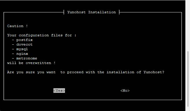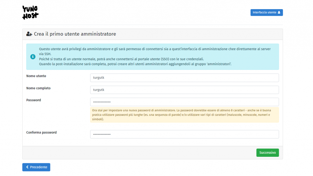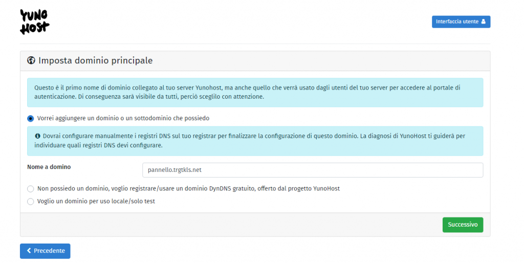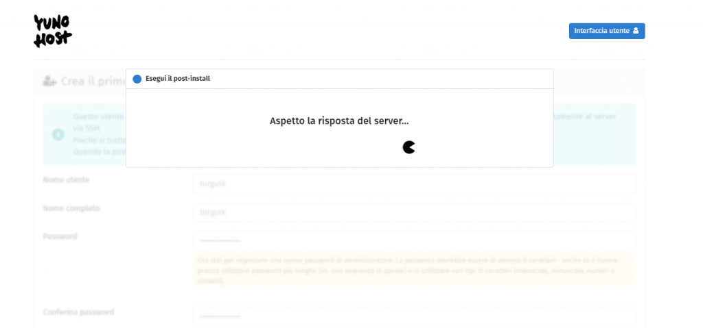 Segui le istruzioni visualizzate sullo schermo per configurare l'installazione di YunoHost.