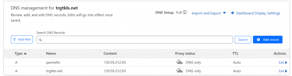 Aggiungi un record A per pannello.trgtkls.it. Basta sostituirlo con il tuo sottodominio. Assicurati di utilizzare solo DNS.