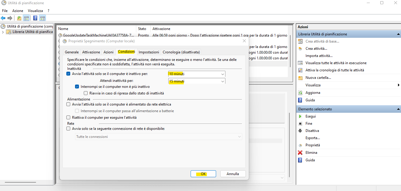 Abbiamo creato e pianificato lo spegnimento, ma dobbiamo darli alcune condizioni in modo che se tu stai lavorando il pc non si deve azzardare a spegnersi. Quindi vai alla scheda Condizioni e seleziona la casella di controllo Avvia l'attività solo se il computer è inattivo. Inserisci il limite di tempo fino al quale il tuo PC può rimanere inattivo prima che intervenga lo spegnimento automatico; fare clic su OK per finalizzare le modifiche. Verrà impostato uno spegnimento automatico per Windows.
