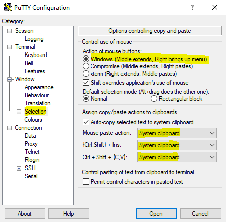 Dunque facendo qualche analisi e qualche ricerca, mi sono imbattuto ad un paradosso. Il problema che putty non incolli cio che noi selezioniamo deriva dalle impostazioni di comando e delle digitazioni. Per risolvere questo maledetto problema condivido con voi la mia soluzione che mi ha permesso di riuscire a connettermi al mio server, Con questa mia impostazioni sono riuscito ad attivare la finestra del clic destro ove e possibile copiare incollare e fare tante altre cose che prima non mi era permesso di fare.