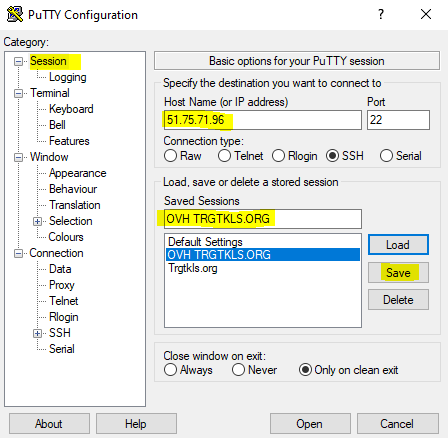 Inserite IP dedicato al vostro server, e la pora che ascolta SSH. Se impostato come default lasciare il campo a 22. Inserire nella casella Saved Sessions il nome della sesione che volete salvare le impostazioni che avete settato, cliccare Salva. E tutto d'ora in poi al vostro prossimo collegamento potete cliccare semplicimente o al nome inserito oppure cliccare sul nome salvato per poi cliccare Load.