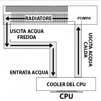Un semplice esempio di sistema di raffreddamento ad acqua: una pompa fa circolare l'acqua attraverso un blocco d'acqua (un dispositivo simile a un dissipatore di calore) collegato al processore; lì, il calore del processore passa nell'acqua. L'acqua riscaldata continua verso un radiatore sul retro del case del computer e viene sostituita da acqua fredda. Il calore dell'acqua nel radiatore viene dissipato nell'aria che circonda il computer. Quando l'acqua si raffredda a temperatura ambiente, viene nuovamente restituita dal sistema.
