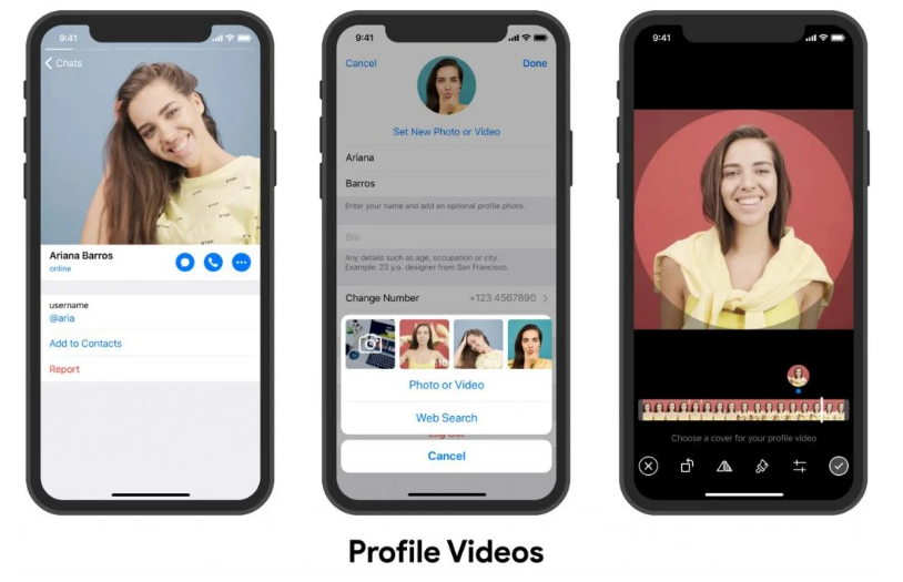 Gli utenti saranno in grado di utilizzare Telegram Media Editor per aggiungere adesivi o animazioni quando determinano i loro video di profilo. Inoltre, insieme ai video di profilo, l'editor video di telegramma è stato aggiornato e ha funzionalità come il ritaglio e la rotazione dei video.