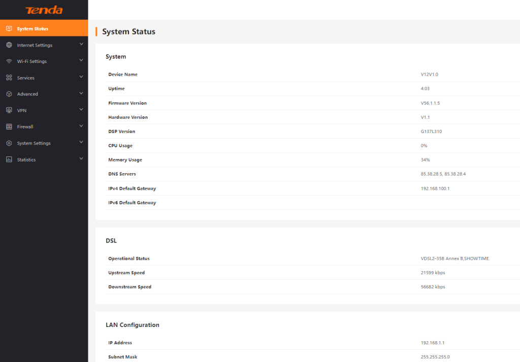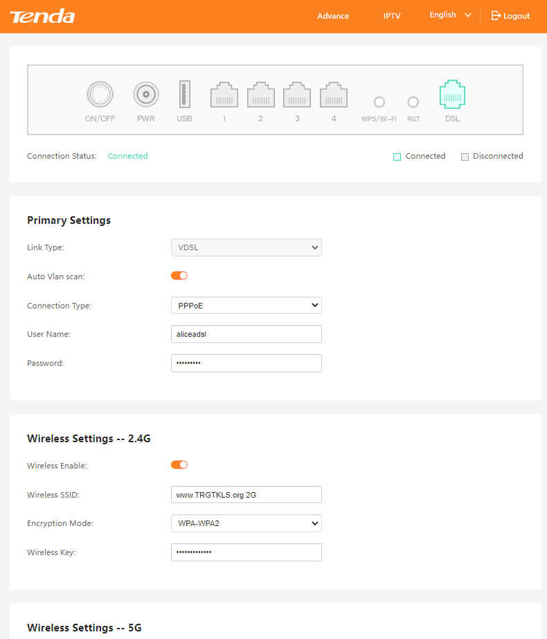 La schermata principale ne facilita l'uso per non professionale, ciò consente di configurare il modem velocemente, sarebbe il metodo più pratico. Tenda ti consente di scansionare in automatico VLAN per poterti dare la possibilità di identificare la linea. Puoi anche impostare la tua Rete wifi impostando il nome SSID, e modificare la password scegliere canali.