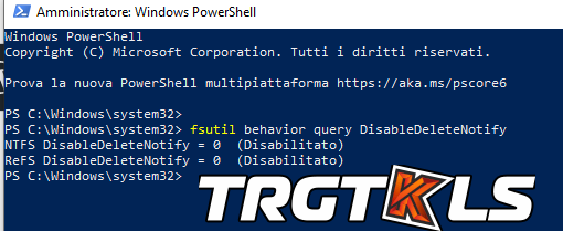 Dopo aver eseguito il comando, noterai lo stesso valore DisableDeleteNotify = 0 che indica che la funzione è abilitata.