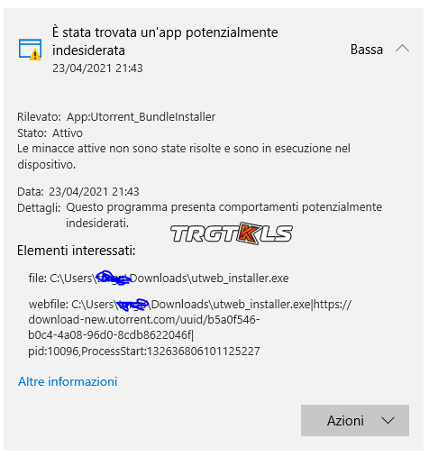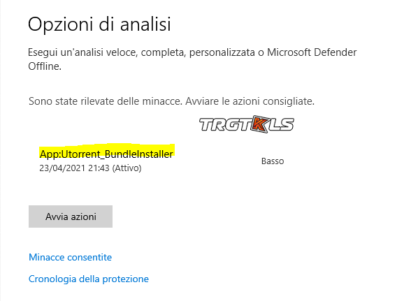Come vediamo in foto, windows defender ha bloccato l'avvio dell'installazione di utorrent. ribadendoci che questo programma e altamente indesiderato.
